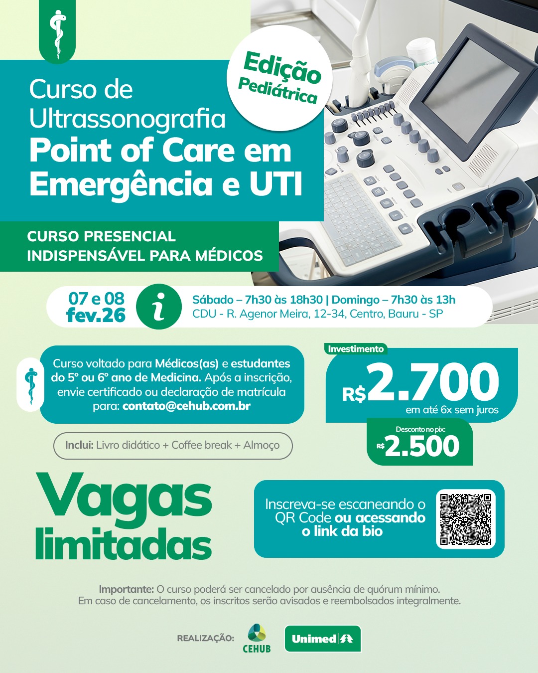 O Centro de Estudos do Hospital Unimed Bauru (Cehub) realiza, nos dias 07 e 08 de fevereiro de 2026, das 7h30 às 18h30( no primeiro dia) e das 7h30 às 13h( no segundo dia) a 4ª edição do Curso de Ultrassonografia Point of Care em Emergência e UTI – POCUS, que acontece no Centro de Diagnóstico Unimed (CDU - rua Agenor Meira, 12-34 - Centro, Bauru).
