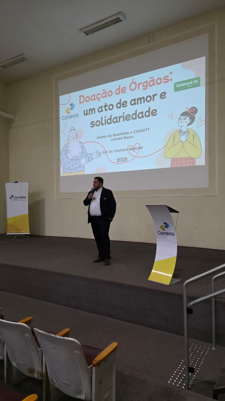 Convidado pela organização, o enfermeiro Cariston Benichel, coordenador da Gestão da Qualidade do Hospital Unimed Bauru (HUB) e responsável pela Comissão Intra‑hospitalar para Doação de Órgãos e Tecidos para Transplantes (CIHDOTT), conduziu a apresentação. O evento ocorreu no auditório da sede dos Correios e foi transmitido ao vivo pelo Microsoft Teams, permitindo a participação de colaboradores de outras cidades.